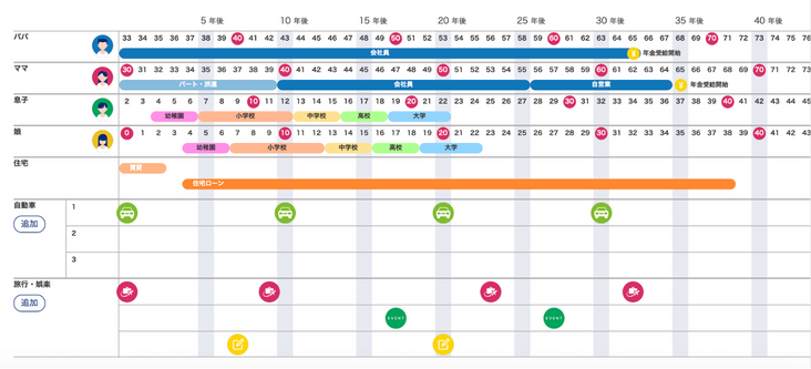 結婚・出産・教育・住宅・老後まで、家族の予定を時系列で見える化。