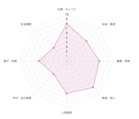 お金だけでなく、仕事・家庭・健康・趣味など人生全体のバランスを可視化して、自分らしい人生設計を考えるサポートをします。になります。